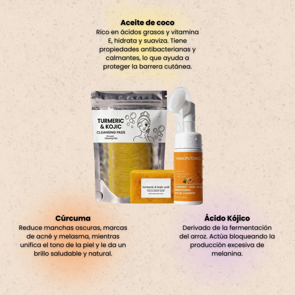 La cúrcuma es conocida por sus propiedades iluminadoras, lo que significa que ayuda a reducir la hiperpigmentación, manchas solares y marcas de acné—pero no blanquea ni aclara más allá de tu tono natural.